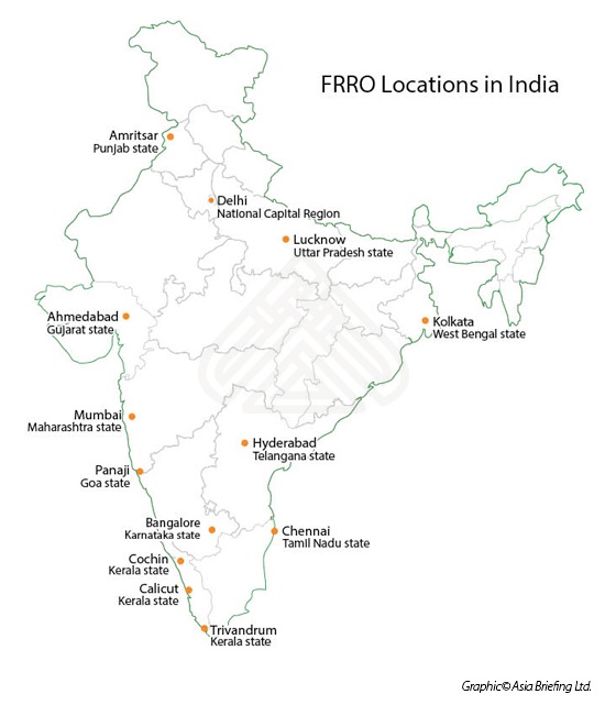 A map of the locations of Foreign Regional Registration Office (FRRO) branches in India. All expatriates who have an India visa, must register it here.