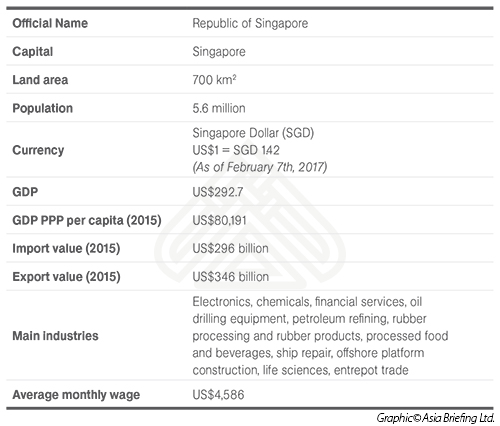 This table gives a general overview on Singapore, giving information such as the population, GDP, import value, export value, and average monthly wage.