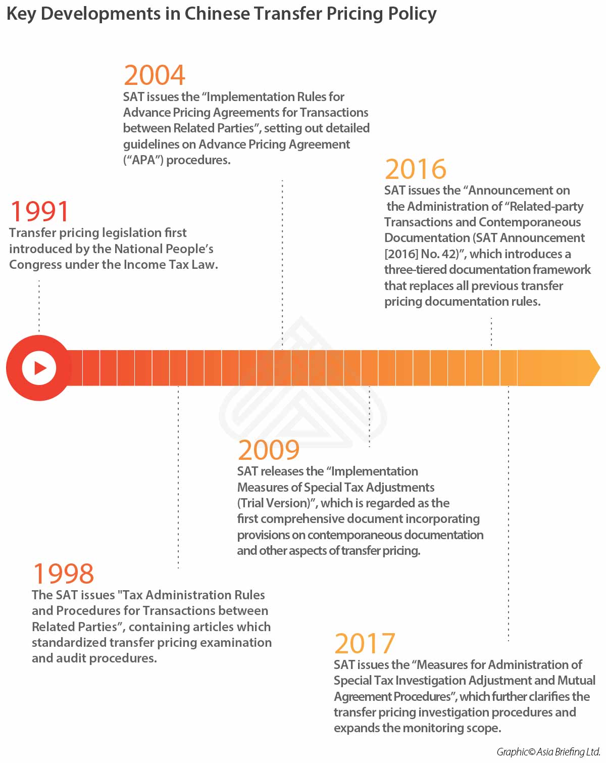 China’s legislation on transfer pricing can be traced back to the early 1990s, but this legislation was very basic. It was not until 2009 that China implemented a much more comprehensive transfer pricing norm. Since then, China has been a key player in the development of international transfer pricing guidelines.