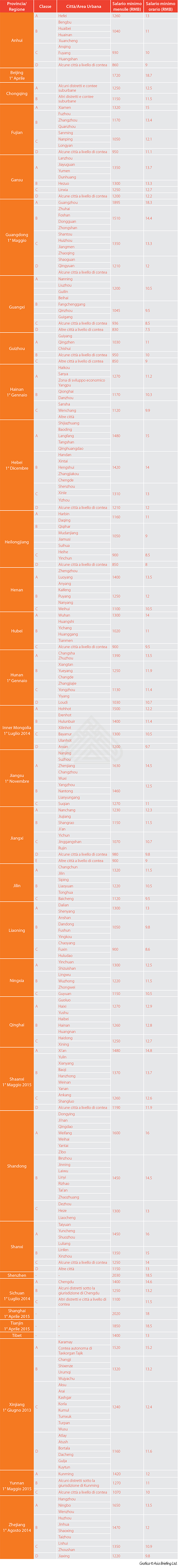 La seguente tabella mostra i livelli minimi salariali mensili e orari nelle principali città di ogni provincia cinese.