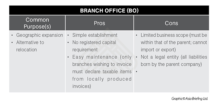 This table shows what are the common purposes, pros and cons of a branch office in China.