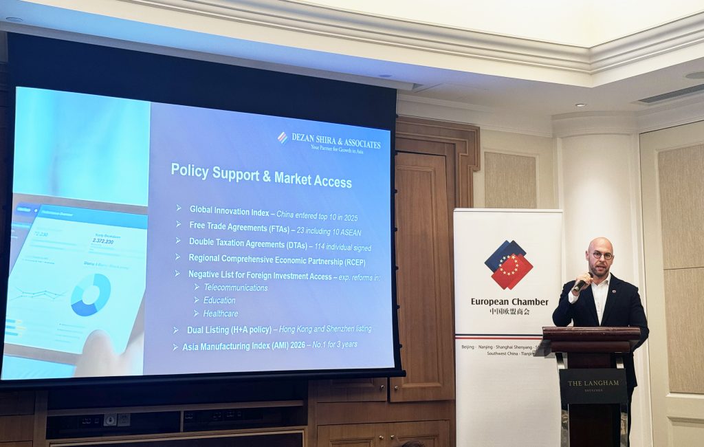 On January 29, 2026, Dezan Shira & Associates participated in the “EU SMEs in the Greater Bay Area: Briefing & Business Clinic”, co-organized by the European Chamber South China Chapter and the EU SME Centre, in Shenzhen.