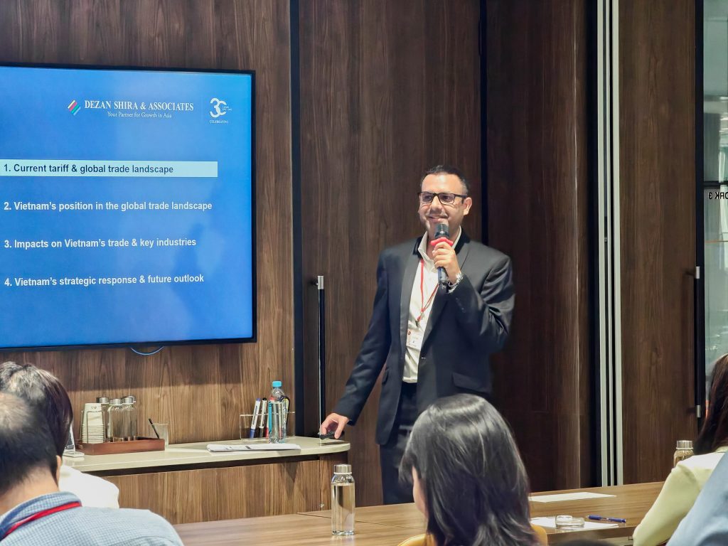 Pritesh Samuel, Head of the Business Intelligence Unit at Dezan Shira & Associates, shared insights into shifting trade policies and global supply chain realignments. He outlined how geopolitical developments and changing trade patterns are reshaping Vietnam’s role in global manufacturing, presenting new opportunities for supply chain diversification alongside emerging risks.
